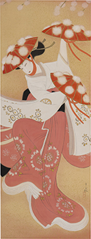 もう一つの売れ筋は、吉原をはじめとする郭の花魁たち。容易には会うことが出来ない彼女たちも浮世絵の好題材でした。そして、彼女たちが得意とした芸事も注目されて、三味線を爪弾いたり、舞い踊ったり……巧みな芸の姿を浮世絵に取り込むことも積極的に行われていました。その流れを引き継いで描かれた近代の日本画には、物語のヒロインや遊女や芸舞妓、日本舞踊をテーマにしたものが数多くあります。ここではそれぞれを分野ごとに展示して、その魅力に迫ります。