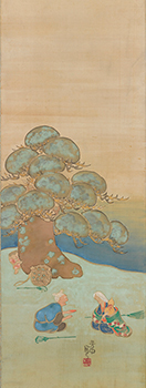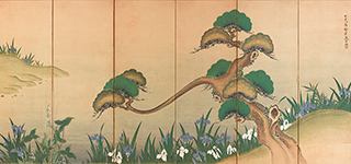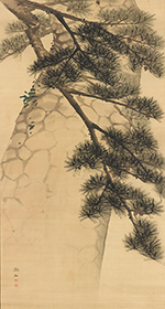 このような意味を持つ松が奈良時代、平安時代の日本に伝わり、絵画や文様に取り入れられることになります。北宋時代(10世紀〜12世紀)に水墨山水画が盛んになると、日本でも松に様々な精神性を託す文人画が描かれるようになります。中国の影響を色濃く受けた松が描かれる一方で、松に対する日本独自の信仰や物語に由来する造形も生み出され、発展していきます。室町時代から江戸時代にかけてつくられた、さまざまな松の絵画と工芸品を鑑賞できます。