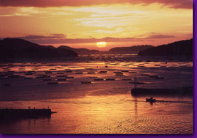 迫門の曙の見頃は秋と伝えられ、立春から数えて二百十日目前後の一週間が最高と言われています。虫明湾から東の空を望み、長島と鴻島の間、その先の大多府島と頭島の間、さらにその先の鶴島と鹿久居島の間、天と海の接する辺りから朝日が昇りはじめると、空と海、島々は美しく黄金色に染まり、その景観はまさに荘厳そのものです。